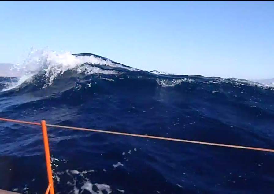 TaraTari est sur la tranche. Les rafales claquent, couchent le bateau qui, vaillant, se redresse et encaisse. Comme toujours dans le vent fort, les vagues surexcitées s'agitent sans souffler, elles. Hautes, courtes, inconfortables. Fichues vagues. ça déferle. je m'en prends plein dans la figure. pas trop le temps de se lamenter, il faut réduire la toile. J'avais déjà pris un ris dans la grand voile, mais pas le choix, je l'affale entièrement. je suis plutôt contente de moi, car la voile est plutôt proprement pliée et bien ficelée et puis ça réchauffe, il faut voir le bon côté des choses.