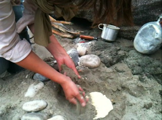 posé la pâte sur le feu recouvert: les braises restent chaudes malgré le sable.